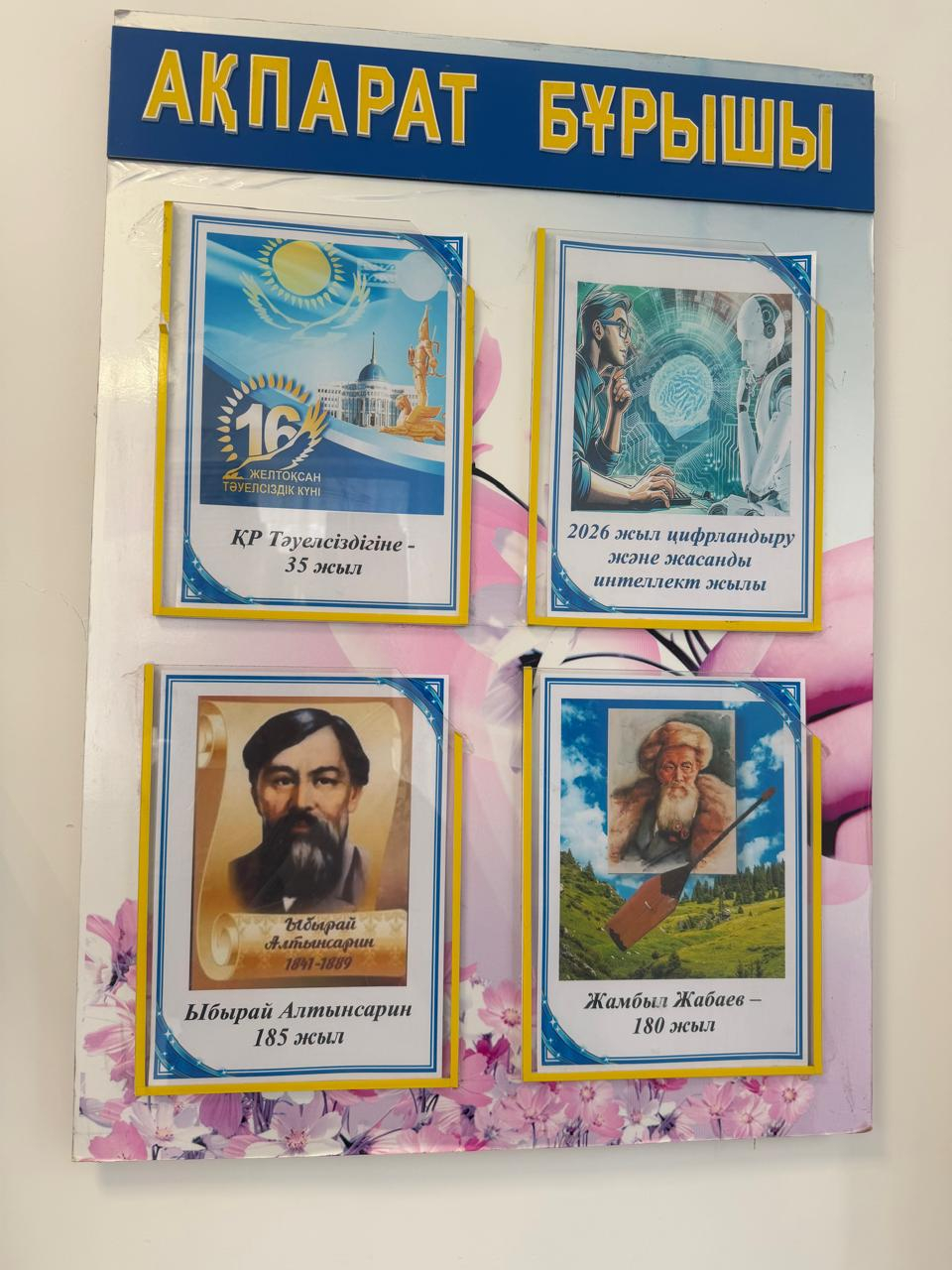 Кітапхана. Ақпараттық бұрыш. Кітап көрмесі.